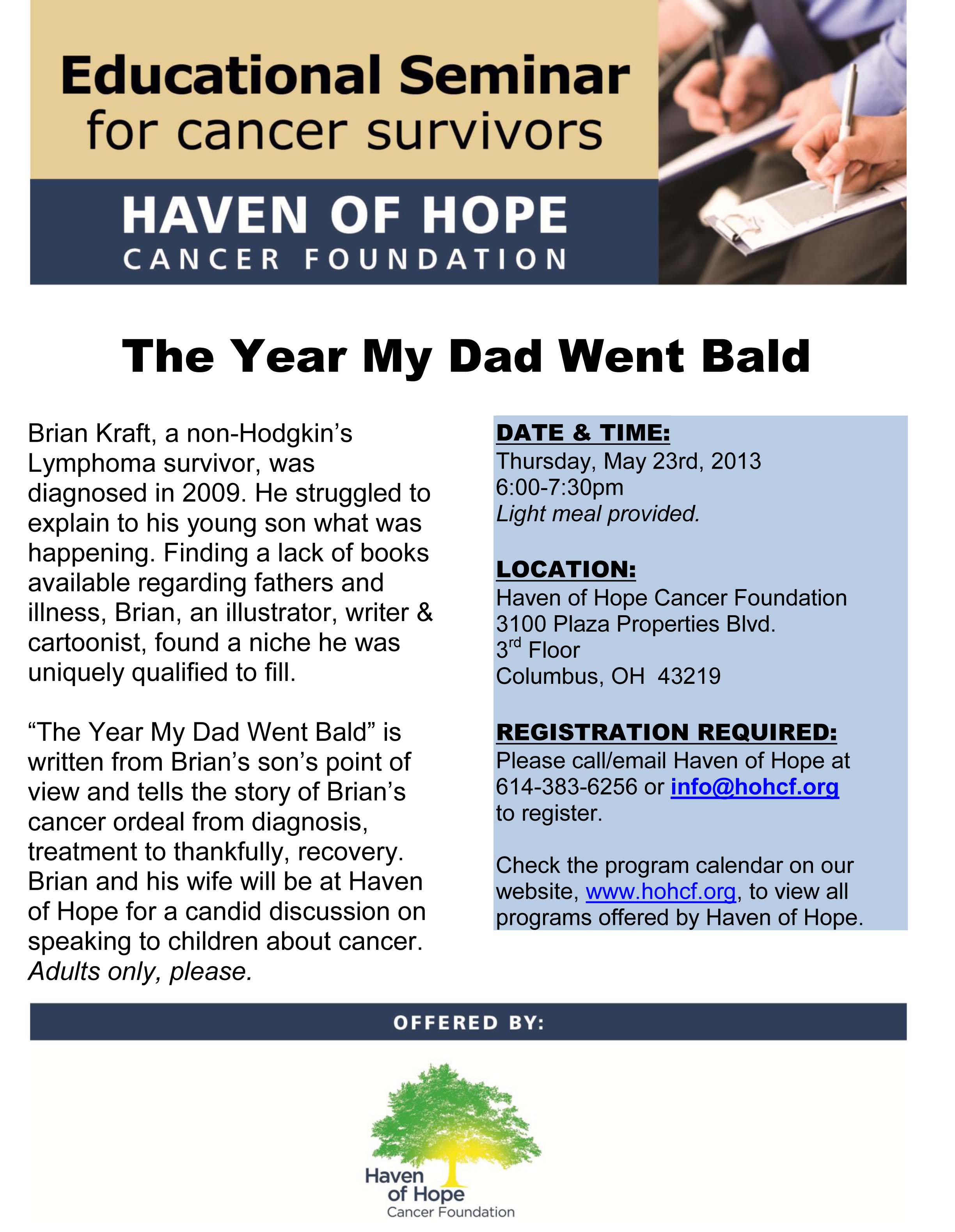 Book lovers and Cancer haters, if you missed last month’s Evening with an Author event at the JamesCare Center, Nicole Kraft and I will be featured speakers at Havens of Hope Cancer Foundation this Thursday (6pm). We will be discussing the creation of “The Year My Dad Went Bald” and sharing stories. The event is free but registration is required. For more info please call/email Haven of Hope at 614-383-6256 or info@hohcf.org to register.